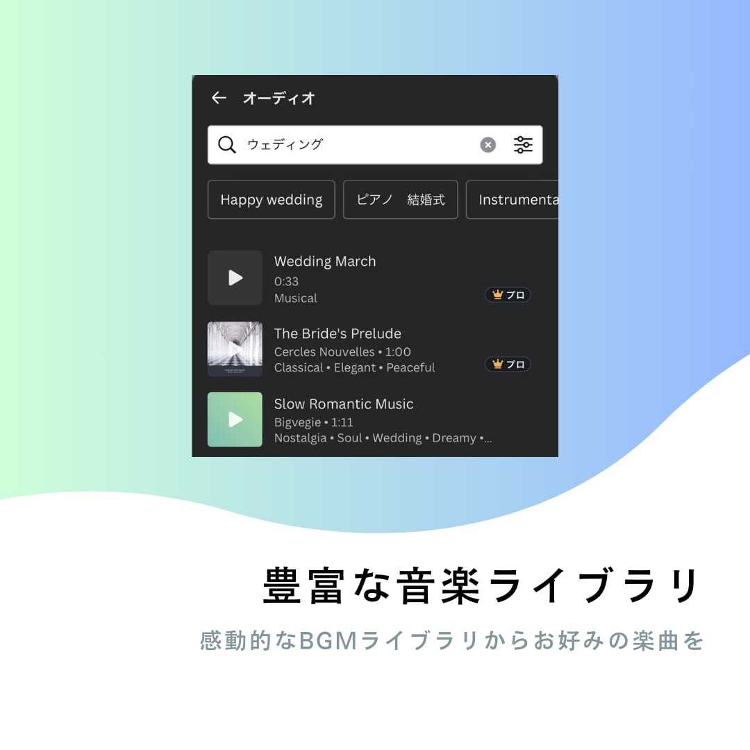 Canvaには無料で使える素敵なBGMが多数揃っています。豊富な音楽ライブラリから、あなたのイメージに合う楽曲を見つけることができます。もちろん、ご自身の大好きな楽曲を挿入することもできます。
