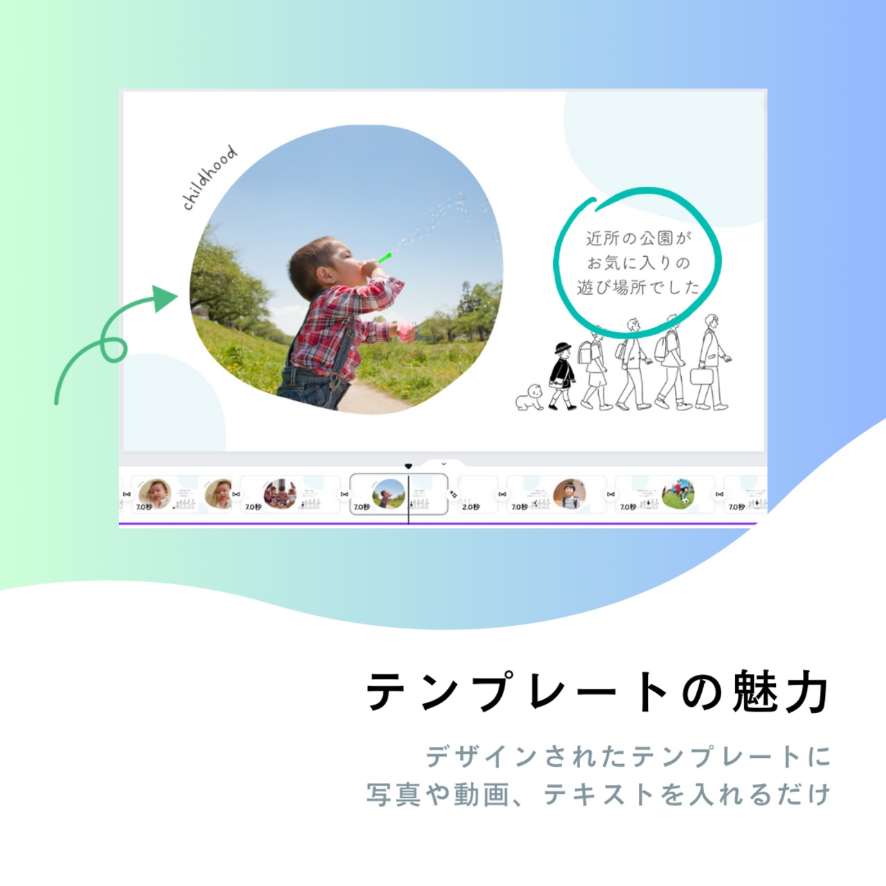 「テンプレート」とは、予めデザインされた枠組みで、お客様は写真やテキストを自分のものに置き換えるだけ!時間と労力を大幅に節約し、ムービーの内容を充実させることにフォーカスすることができます。必要なのはあなたの創造力だけです。